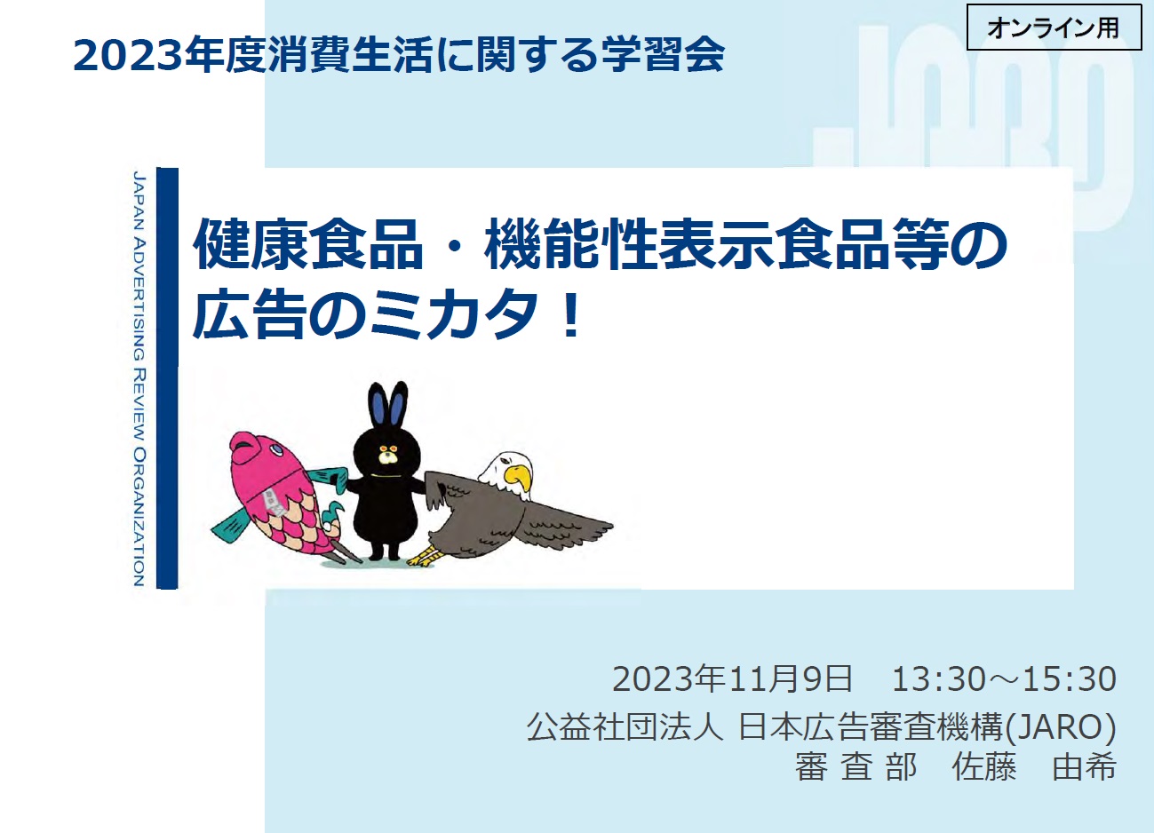 健康食品(サプリメント)は医薬品と違って、健康な人の摂取を前提としており、健康の維持を目的としています。特に高齢者はそのあたりを理解しないまま、テレビショッピングなどで購入し、効果を実感できないまま無駄に定期購入の代金を払い続けている方も多いようです。病人は医師の診察を受けた上で処方される医薬品を飲む、それが原則です。学習会ではJAROに寄せられたさまざまなトラブル事例も紹介されました。「初回お試し」との表示があれば定期購入が条件であるとか、医薬品ではないのに、医薬品のような効果が期待できそうなイラストや体験談は「あやしい」と思ってください。