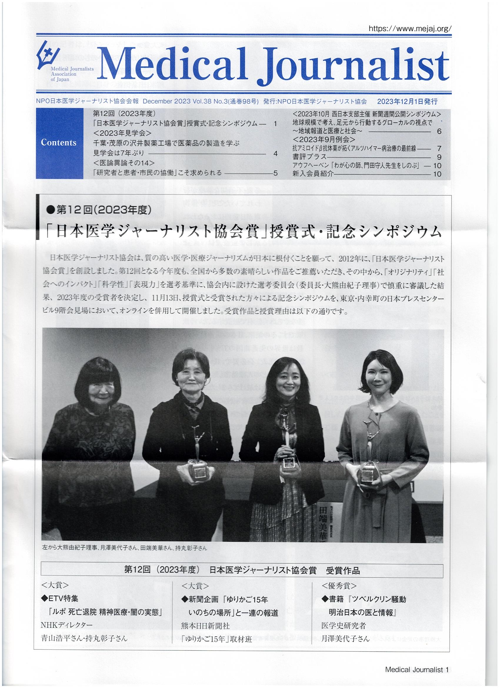今回の会報のメインコンテンツは、11月に行われた「医学ジャーナリスト協会賞」の詳報。発表の模様は協会のホームページから、どなたでも視聴できる。