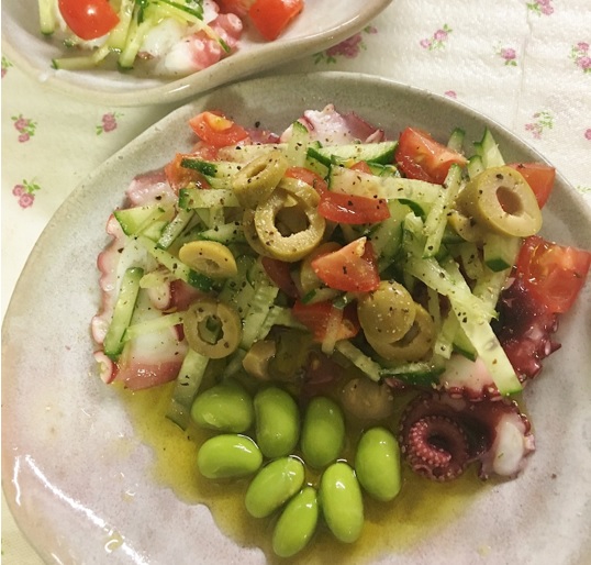 生のタコを買ってきて、その上にオリーブとトマト、キュウリ、枝豆を刻んでのっけてオリーブ瓶に入っていたオリーブオイルをかけて、コショウを振っただけのサラダである。実にシンプルで調理時間もわずか15分。しかしこれが、うまいのだ(笑)。