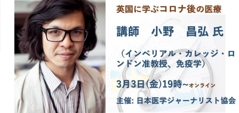 日本医学ジャーナリスト協会の3月定例会では、T細胞の動態を解析する測定技術を開発した免疫学者・医師の小野昌弘氏(インペリアル・カレッジ・ロンドン准教授、免疫学)が、ワクチンのエビデンスに関する最新の知見や、新型コロナウイルスに関する社会コミュニケーションの課題などについて講演。「今後はどうなるんだろう?」と先行きの不透明さに不安を持つ医療・介護関係者はもちろん、報道する側の人間としても認識すべきことの多い、価値ある機会となりそうだ。
